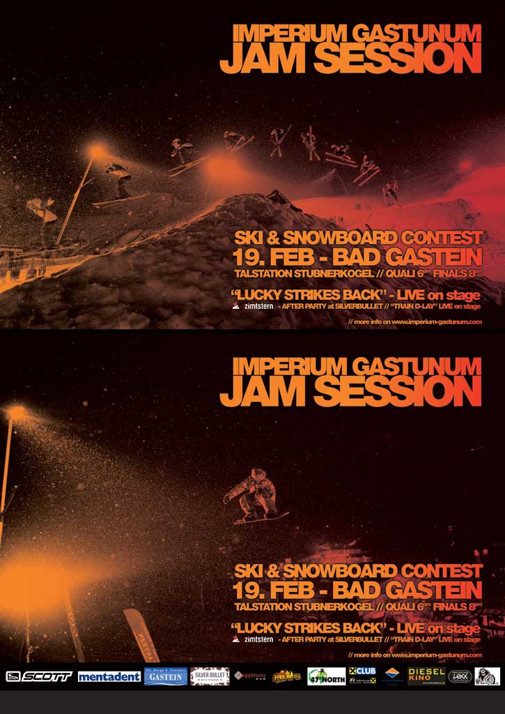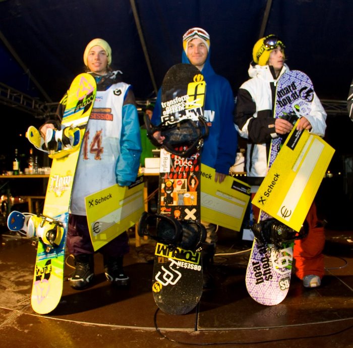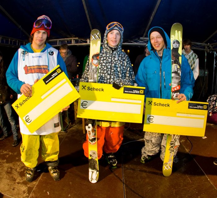 At the Jam Session 2010 an international group of riders from 7 countries competed for the win and a total of 3000 € of prizemoney. For the first time the riders could earn some extra money for some extraordinary tricks. The moderator Jon Weaver rewarded the best tricks with 5 € cash. Despite the bad weather a considerable crowd appeared at the Buchebenwiese Bad Gastein and contributed to an awesome atmosphere at the contest. The relaxed contest day ended at the Zimtstern After Party at Silverbullet Bar and finally the Jam 2010 went smoothly and only leaves one wish for the next Jam Session: better weather!